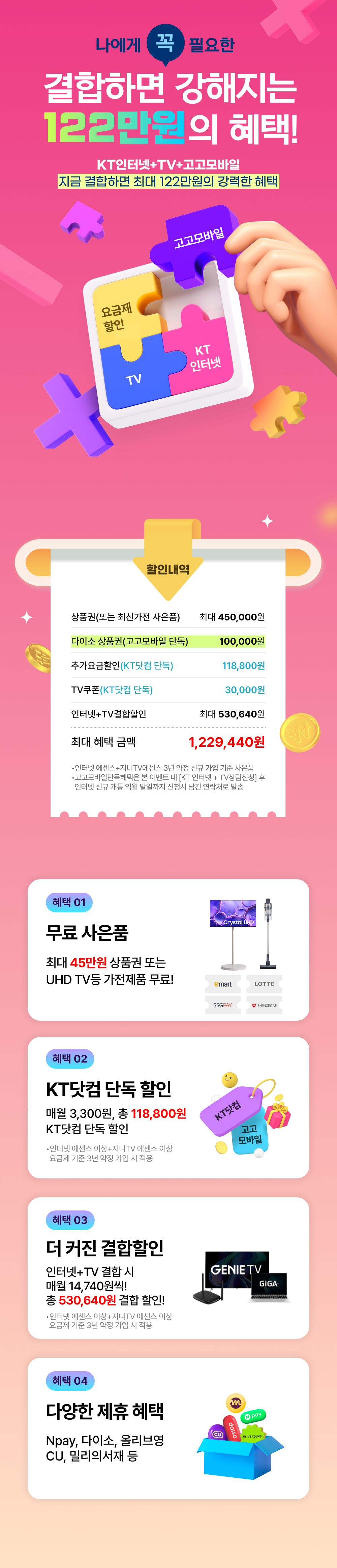 ○ 인터넷+TV 가입하고 결합하면 최대 122만원 상당의 혜택을 제공해 드려요.